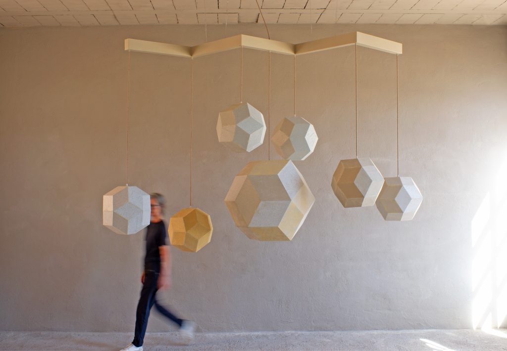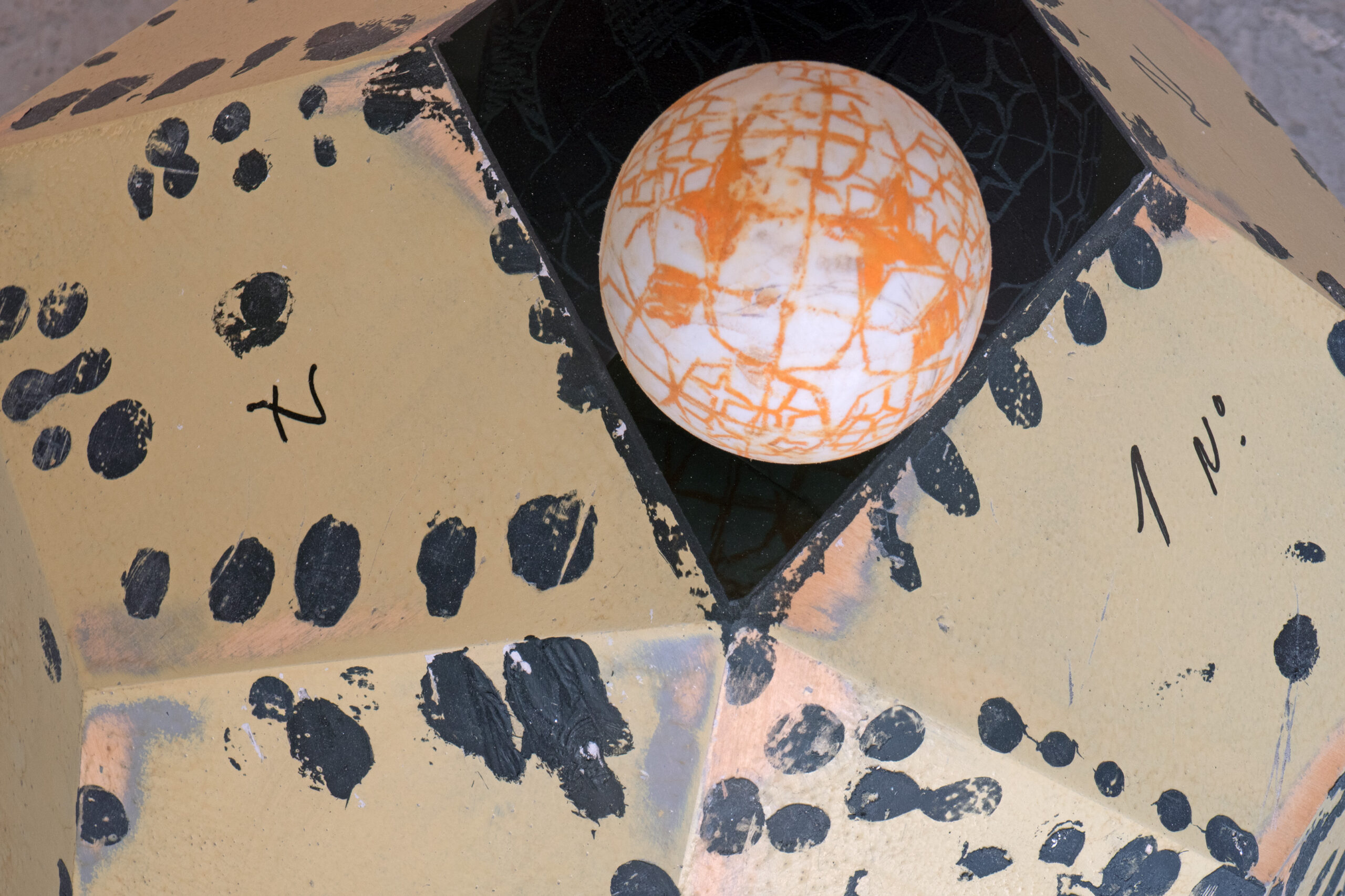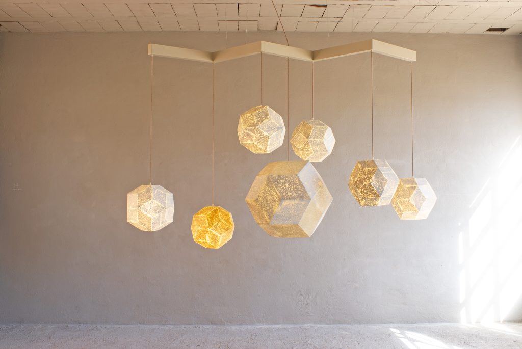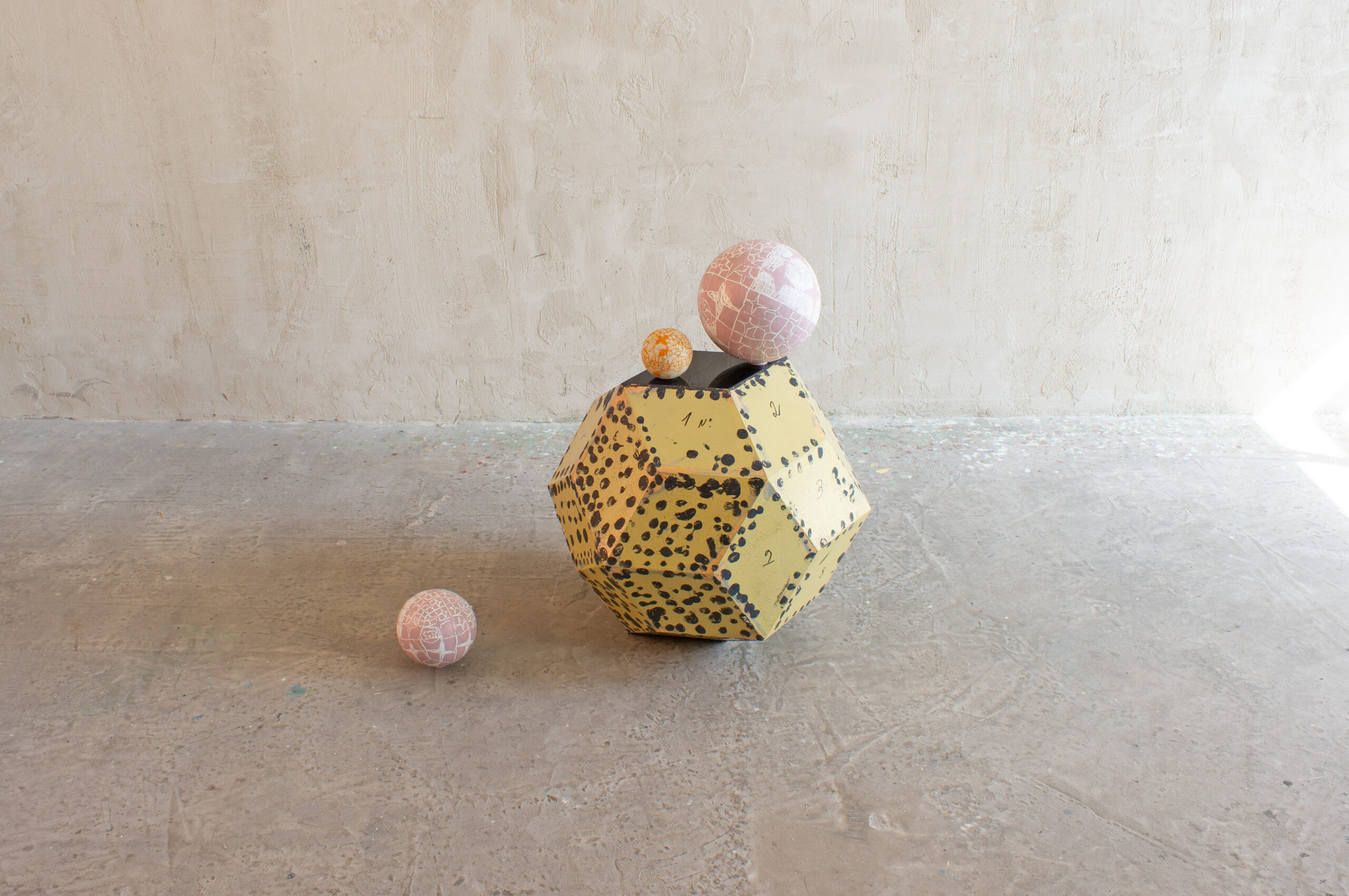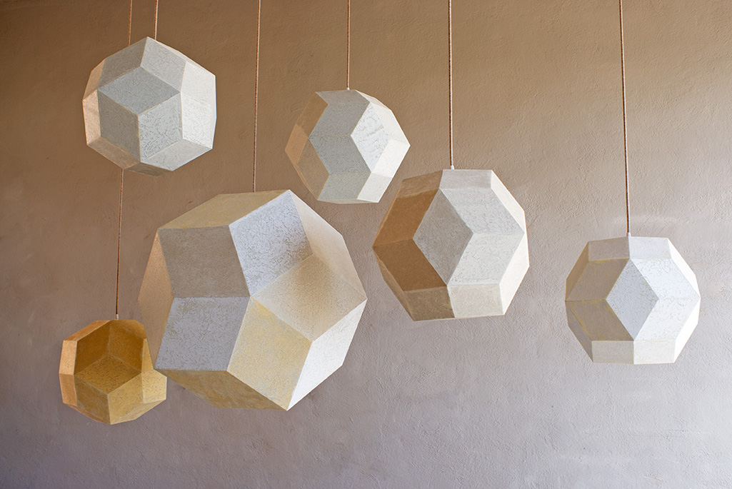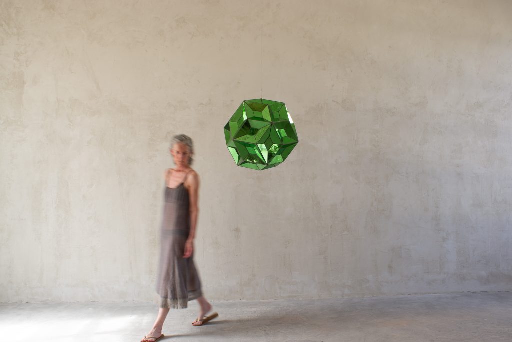 A faceted free-standing Catalan solid and three spheres (found objects), each painted with drawn lines and geometric forms. New work using familiar shapes and patinas, echoing the luminous Fiore del Cielo chandelier, the mirrored Stella della Foresta, and other suspended installations.